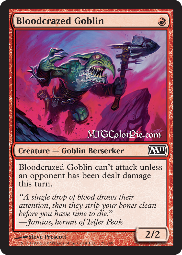 Yes, Red’s shortsightedness is what makes the color interesting. By wanting to go all in and win now (if you deal damage first, I’ll taste blood and attack), Red will constantly put pressure on. Screw the long game, let’s win this tonight (I imagine the Red creatures have this video on loop in their barracks). So goes along with Bloodcrazed Goblin, and that’s not the only card in M11 that wants you to deal damage before you attack: