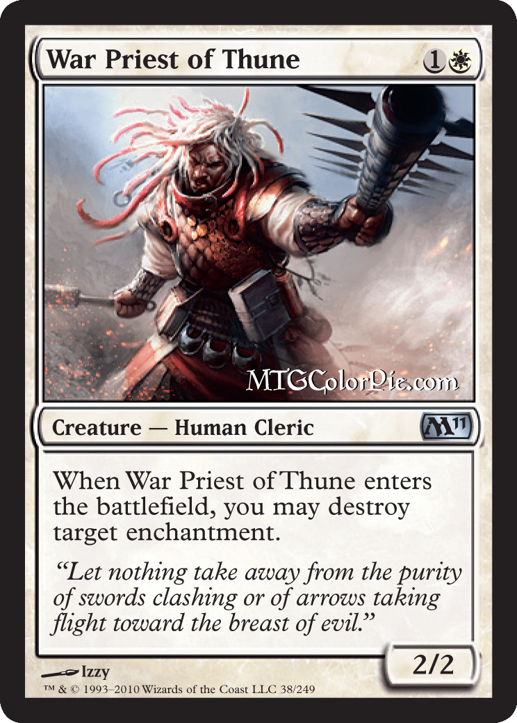 A very simple card, War Priest is the only uncommon we’re going to look at today (But don’t worry, it’s not all about rarity). Known as a Bear, this 2/2 for 1W is efficient and something that @Grizzly_Bears would love to see. Obviously what makes this an uncommon (and better than our furry friend (Sorry)) is its enter the battlefield ability. It’s common for White to get effects like this, but this might be one of the more efficient ever. Way better than its predecessor: