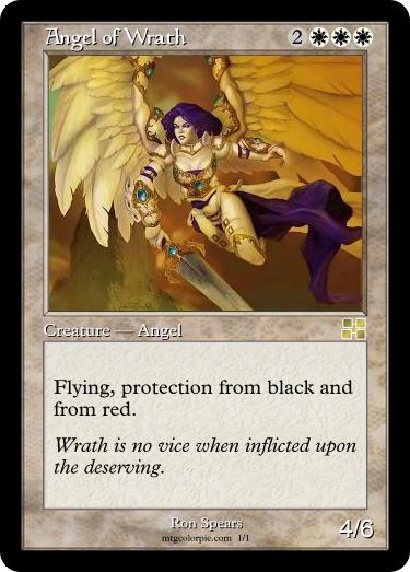 Baneslayer is a little bit more impressive at the same casting cost. While she can be Doom Bladed and Combusted, Baneslayer gains you life, and has first strike, and can protect against Red and Black’s two large iconic races. Giving a creature protection from its enemy color’s two iconic creatures seems much more epic and legendary than just the colors in general; it’s as if she’s going into battle trying to defend and defeat them. With “Angel of Wrath”, she just seems like a pretty good angel but enough for Legendary status. I mean, Stoic Angel seemed Legendary, but having more than 1 in play is a dumb idea so there’s no need to make her Legendary.
