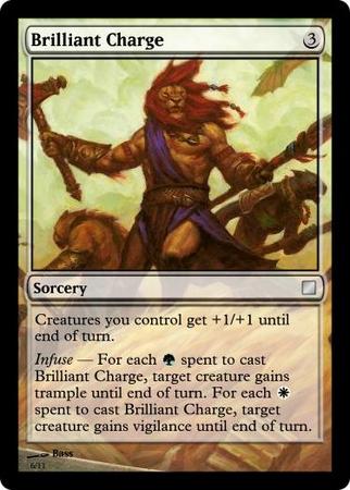 Infuse – When you cast Brilliant Charge, for each G spent to cast it, target creature gains trample until end of turn, and for each W spent to cast it, target creature gains vigilance until end of turn.