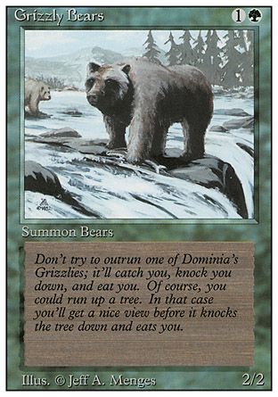 This story isn’t really about design but it’s become such a classic story (and it involves kicker) that I felt obliged to tell it once again. (And yes, I know I told it during my Invasion Week article, Body Snatchers of the Invasion.) During Invasion development I played frequently in the FFL (the Future Future League, where we play many months ahead to try and figure out what the future environment will be like). Because I wasn’t the best of deck builders (at least a Spike deck builder; I could hold my own in a Johnny world), I usually got decks from other developers. Randy Buehler was running the FFL at the time, and he gave me a red-green deck to play. In it were four Grizzly Bears. I didn’t think anything of it at the time. I then went on to go 4-0 that week. I was the only person with an undefeated record.