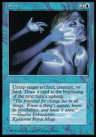 Your writing of the sequence of events leading up to the creation of Infuse and the revealing of the card in its beautiful beautiful-ness is beautiful. I felt excited when I imagined drafting Infuse cards and casting them for their Infuse effects. Very cool.