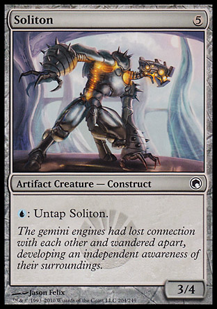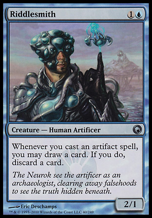 Uncommon: Best: White. Just because it gets around even more than Stoneforge. I remember at my first Standard tournament after Scars of Mirrodin came out, and I used turn 1, Quest for the Holy Relic, Memnite; turn 2, Glint Hawk, Memnite (again), Glint Hawk, Memnite (again), search for a Sword of Body and Mind. Turn 3, attack with all three, seven damage, mill 10, get a puppy token. Turn 4, attack with all four, six damage, mill 10, lose Memnite, trade puppy with another 2/2, get another puppy. Turn 5, attack with all three, eight damage, win. (Oh, and mill 10 and get a puppy.) Worst: I want to say Quest for the Ancient Secrets, just for being pretty much strictly worse than Feldon’s Cane.