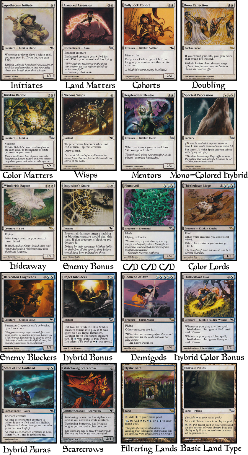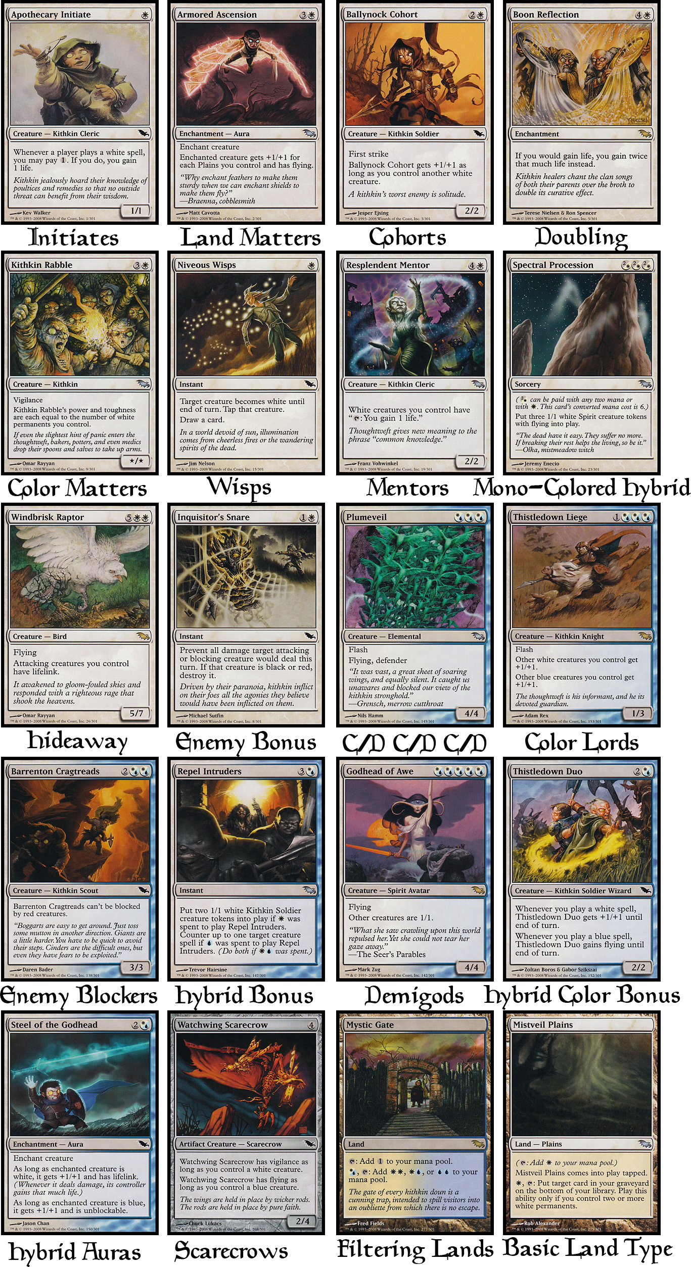 Take a look at most amateur designed sets. For the most part they really don’t have cycles, and if they do they’re at rare trying to be the set’s main iconic cards. They’re over flashy, complicated and completely unnecessary. Of course, that’s not always the case (a bit of generalization there) but you can easily pick them out. Your set doesn’t have to be all cycles either. Imagine an environment where close to half of the cards were part of cycles. I bet some of your can: it’s called Shadowmoor. Out of 229 cards (again, minus basic lands), an even 100 of them were in cycles. Here is a member of each cycle (A White version of it because I don’t want to upload 100 images):