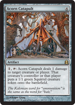 This card tells a story: I launch an acorn across the battlefield and hit a Goblin on the head. If it’s a small Goblin and it was a direct head shot that nut could kill it. But most likely it’s only a flesh wound. Then, a Squirrel comes out of the forest and starts to eat the acorn. You wave your hand and suddenly that squirrel is fighting on your side. It’s cute and not many cards today make full stories like this card.