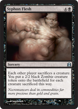 An obvious cycle with Syphon Mind and Syphon Soul/Life. It’s such a simple card idea I’m surprised that I haven’t seen it printed before this. Printed in a multi-player focused set, it completely shines here. Listen, it’s not bad to have such an obvious card design; sometimes the expected is a nice place to hang out. I love the art on this one; not something I would hand on my wall, but hauntingly beautiful.