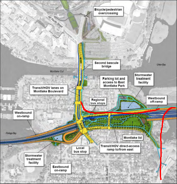 This has been a huge sticking point with the bridge construction. There’s a point where you get off the bridge as it crosses a sliver of land. Of course, within this sliver of a land there is the University of Washington oh, and the east side of Seattle. The designers, with pressure from the Governor (who doesn’t reside in Seattle) and the Sierra Club (so the rumor goes), have decided that several off-ramps that help direct the flow of that 115,000 people must consolidate into one off-ramp exit.