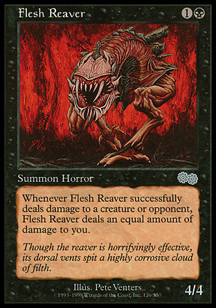 - Flesh Reaver (1R, 4/4, whenever it deals damage to a creature or opponent, it deals damage to you)