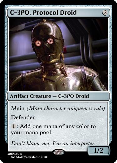 Alright, C-3PO isn’t the shiniest example of this keyword, but he’ll do for now. At the moment, the keyword plays a bunch like a Planeswalker: there can be only one on each side with that name. This gives the game a flavor and a way to curb some of the power (imagine multiple Obi-Wans on one side). The maximum number of cards each character gets at the moment is equal to the number of movies they appear it. C-3PO appears in all six movies, so he can have up to six different cards. This allows a character to show off their different sides and a few of them might end up different colors.