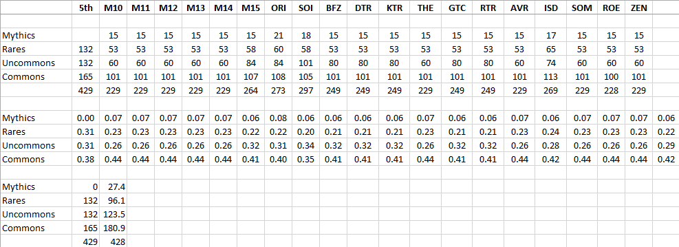 I did the math from M10 onwards of large sets (It was the first core set with Mythics). The top section is the number of each rarity for the sets plus the total. The middle section is the percentages of that comparative to the number of cards in the set. What we get is about 6% of a set’s cards are Mythic, 22% is Rares, 29% is Uncommons, and 42% are Commons. So in a set of 429 cards, 6% of that would be just over 27 Mythics.