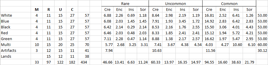 So I did more math. I took the color/rarity/card type count (ignoring mono-colored) and got the percentages of each combined. Since there were some sets that focusing on enchantments or artifacts more, getting all of those sets I was able to find a nice comfortable number. Getting the percentages for all of my sections I applied that to my new cube numbers and got this: